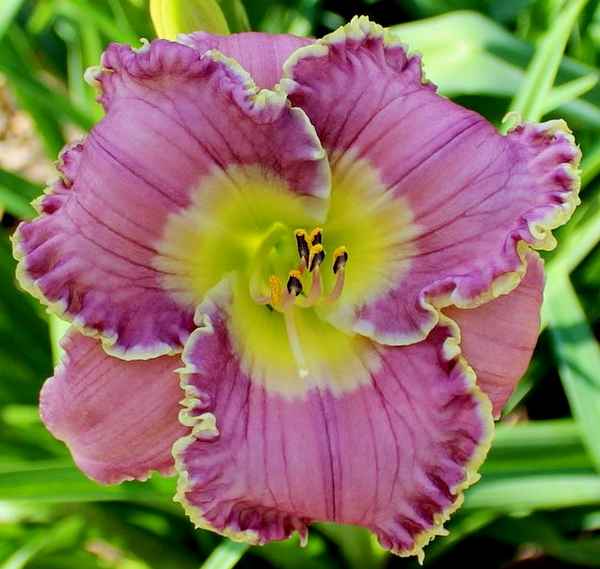 Огромные контрастные 16-сантиметровые цветы с бархатистыми тёмно-пурпурными лепестками и нежным зеленовато-жёлтым горлышком. Края широких лепестков чуть......
