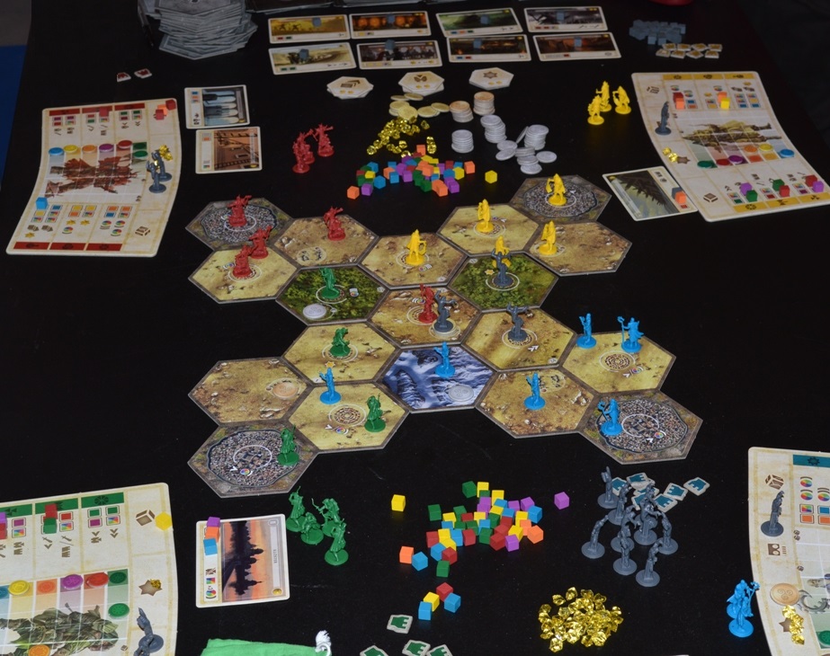 Игровое поле составляется из квадратов, крайние – места старта ваших цивилизации- открытые, остальные 12, при игре вчетвером, перевернуты. После проведение разведки они переворачиваются на лицевую сторону и на них выставляются, в специально обозначенных местах, случайные ресурсы (также скрытые, для уточнения, по всей видимости их придется также исследовать) и воинственные варвары....