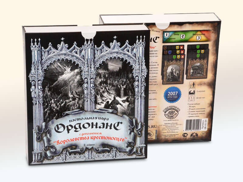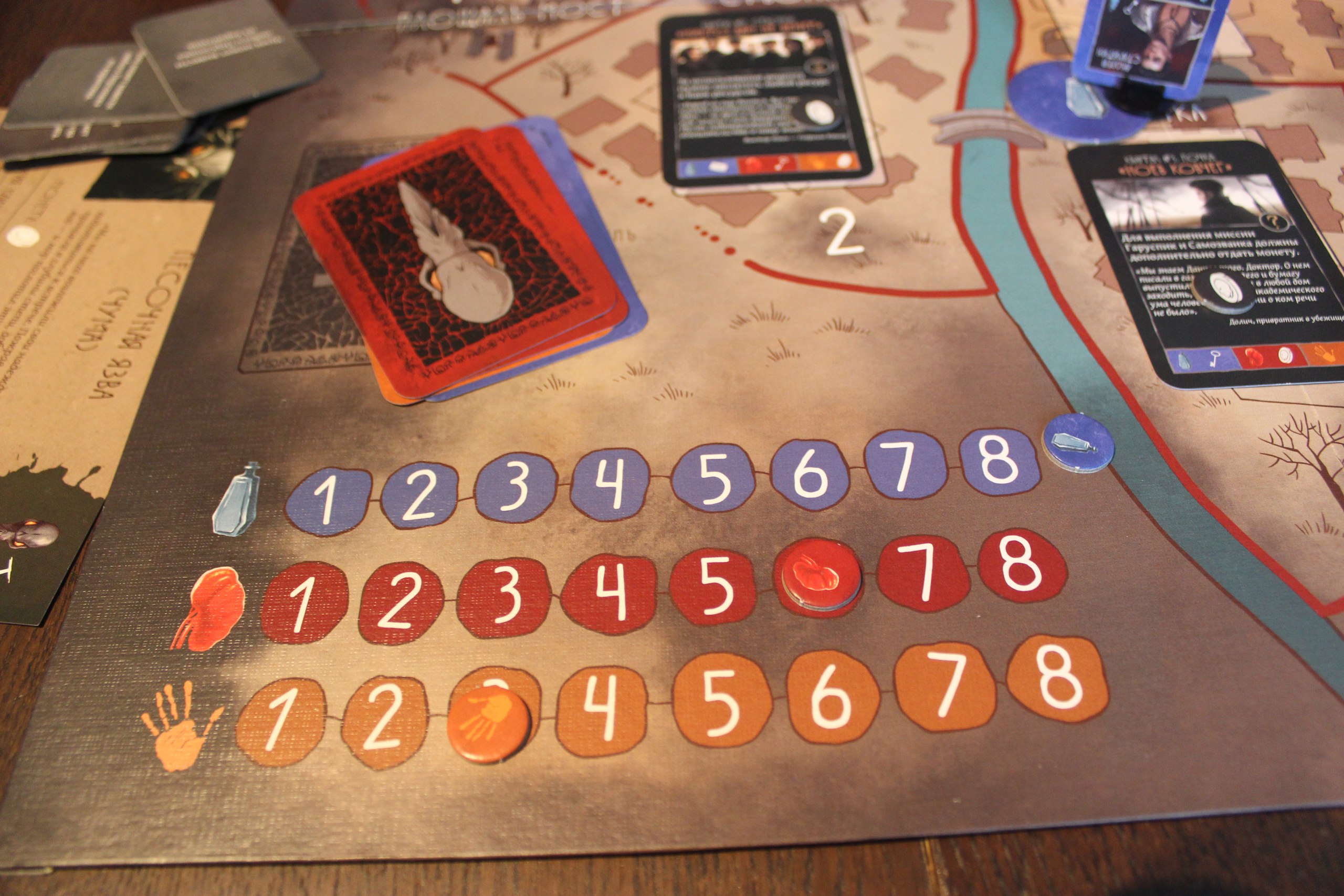 Карты выполнены на твердую пятерку: яркие цвета, хороший картон, прямая вырубка. Поле сделано на удивление хорошо для России, где традиционно не могут (не могли?) в человеческие складные поля. Но самый смак – это толстые акриловые жетоны, по две штуки на игрока. Их не хочется выпускать из рук – хорошо, что только один нужно класть на трек победных очков!...