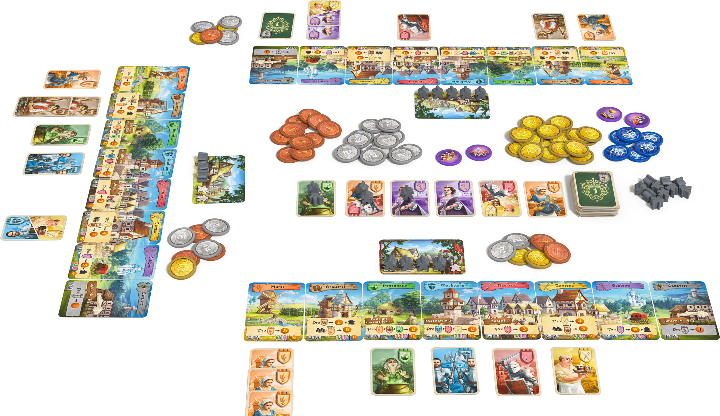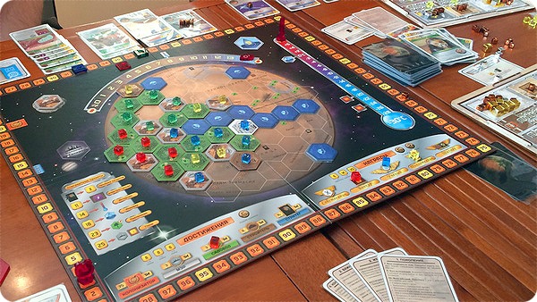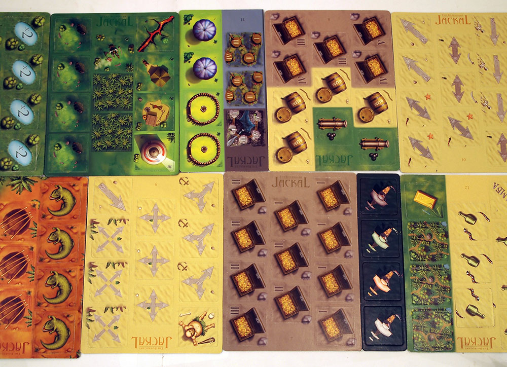 Игра хотя и называется карточной, оперирует не то чтобы картами, а скорее карточками. Квадратными такими. На то есть две причины. Первая — это раскладка: взаимное расположение карточек имеет значение, и квадратная форма несколько упрощает её, делая более компактной. Вторая более интересна: поворотом некоторых карточек предлагается отмечать количество хранящихся на них ресурсов (разные количества указаны вдоль разных сторон), так что здесь прямоугольная форма была бы неподходящей....