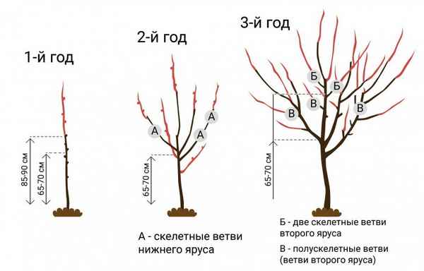 Осенью, после опадания листьев, длинный рукав обрезают оставляя 2 побега. Рукава станут одинаковыми. Затем обрезать вертикальные стeбли: те что ближе к центру и ниже по основному стeблю, обрезать оставляя 2 почки. Это будет сучок замещения.