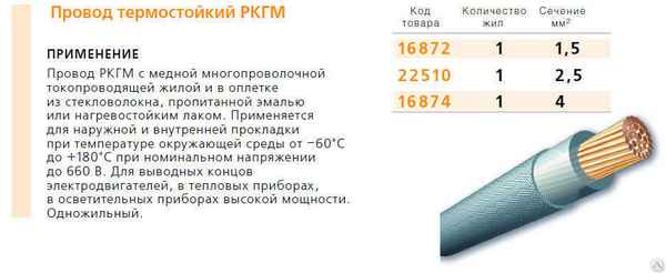 РКГМ 2,5 — провод, который идеально подойдет для монтажа электропроводки в банях и саунах. Такой провод можно использовать в помещениях с повышенной влажностью, обязательно следует использовать в пожароопасных помещениях, а также применять в качестве выводов машин с повышенным нагревом.